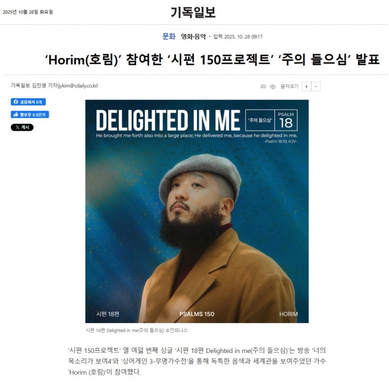 [기사] ‘Horim(호림)’ 참여한 ‘시편 150프로젝트’ ‘주의 들으심’ 발표(기독일보)