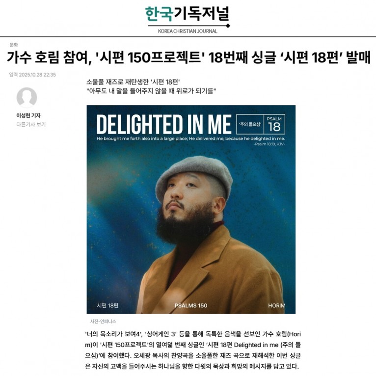 뮤직타임 [기사] 가수 호림 참여, '시편 150프로젝트' 18번째 싱글 ‘시편 18편’ 발매(한국기독저널)