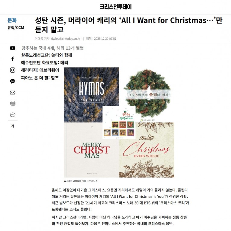 [기사] 성탄 시즌, 머라이어 캐리의 ‘All I Want for Christmas…’만 듣지 말고(크리스천투데이)