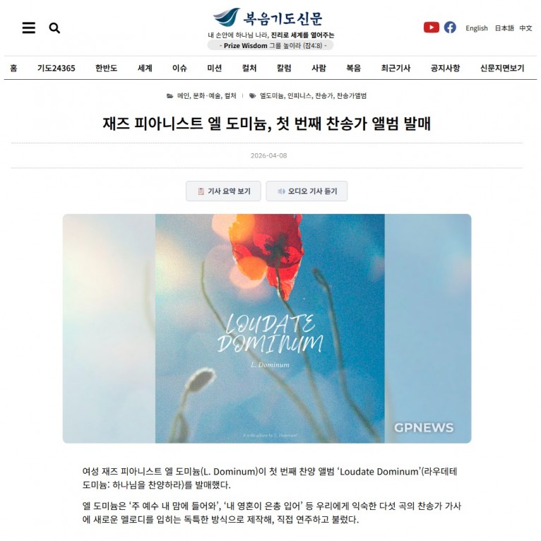 뮤직타임 [기사] 재즈 피아니스트 엘 도미늄, 첫 번째 찬송가 앨범 발매(복음기도신문)